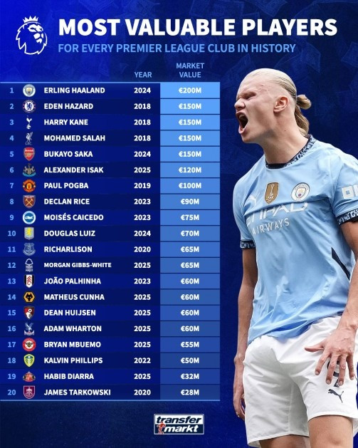 Bảng xếp hạng cầu thủ giá trị cao nhất lịch sử các đội Ngoại hạng Anh: Haaland dẫn đầu danh sách với 200 triệu euro, tiếp theo là 4 cầu thủ với 150 triệu euro