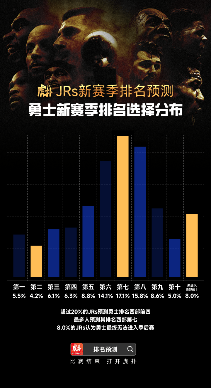 Phân phối dự đoán xếp hạng mùa giải mới của JRs Warriors: nhiều lần thứ bảy và thứ tám, 5,5%, vị trí đầu tiên trong Western Conference, 26 & 8% rơi vào xổ số